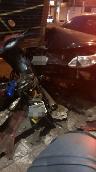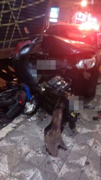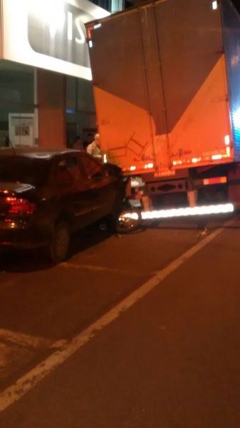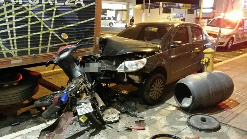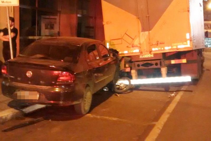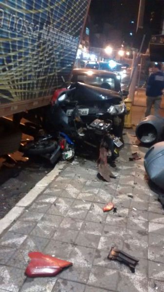 25/08/2015 Um motorista destruiu duas motos e ainda atingiu um caminhão que estava estacionado na noite desta terça-feira (25) em Joaçaba. O acidente aconteceu por volta das 22h30 na rua Barão do Rio Branco em frente a Concessionária de Veículos JOAUTO. O VW/Voyage com placas de Joaçaba descia pela rua, sentido Casa do Chapeador/JOAUTO. O motorista relatou aos policiais que teria cochilado ao volante logo após a sinaleira abrir e só acordou com o impacto. O Voyage avançou sobre duas motos que estavam estacionadas e só parou ao colidir contra a traseira de um caminhão. As imagens feitas pelo publicitário Eliseu Peruzzo mostram as motos completamente destruídas, sendo que uma delas ficou presa em baixo do veículo. Apesar dos danos de grande monta ninguém ficou ferido.