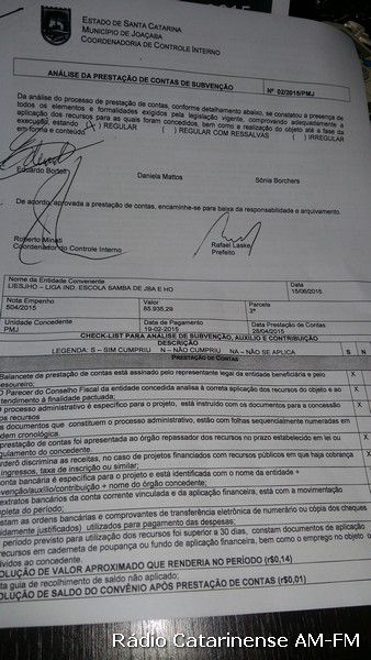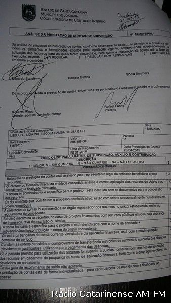 16/09/2015 O presidente da Liga Independente das Escolas de Samba de Joaçaba e Herval d´Oeste (Liesjho), Sérgio de Giacometti, recebeu a aprovação sem ressalvas dos recursos aplicados no Carnaval 2015 oriundos da administração municipal de Joaçaba. A avaliação é com base em 40 itens que estão descritos na análise do processo da prestação de contas.