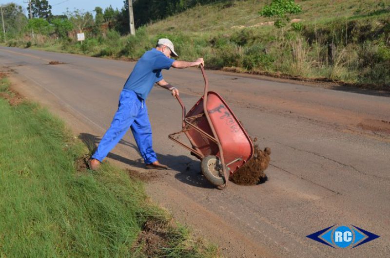 22/09/2015 Uma cena chamou atenção dos motoristas que passaram pela SC-150 na manhã desta terça-feira, dia 22. Cansado de esperar alguma providência da Secretaria de Desenvolvimento Regional de Joaçaba (SDR), o aposentado Noeli Todeschini, de 62 anos, que reside nas imediações da SERP (Sociedade Esportiva e Recreativa Perdigão), com a utilização de uma pá e carrinho de mão resolveu tapar os buracos da rodovia. Ao invés de massa asfáltica, terra.