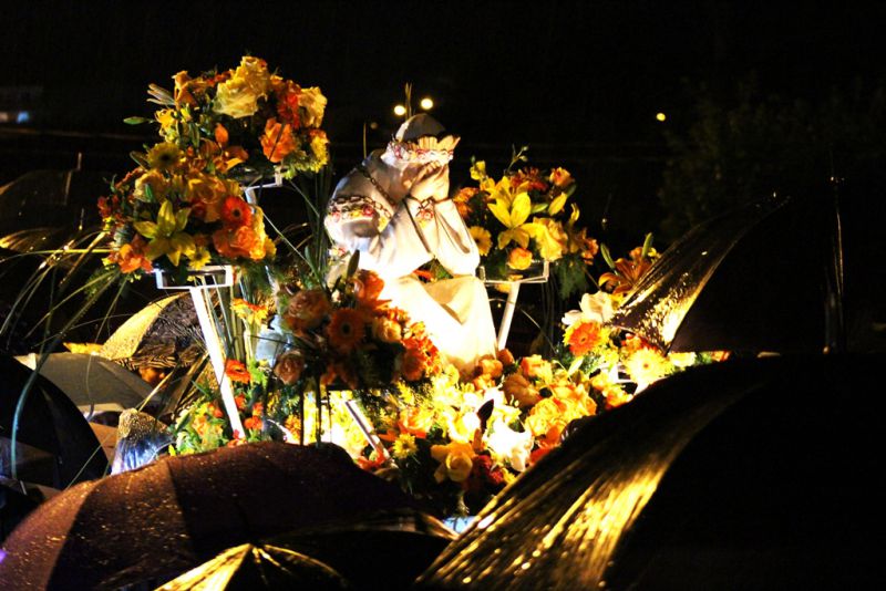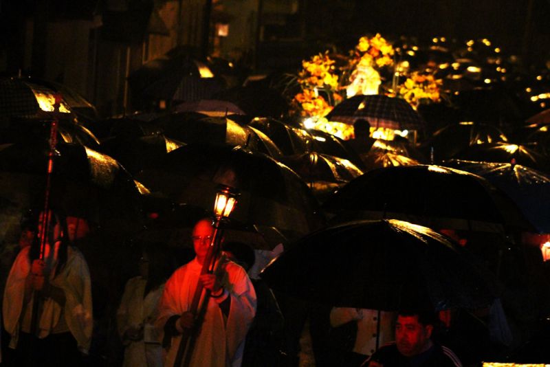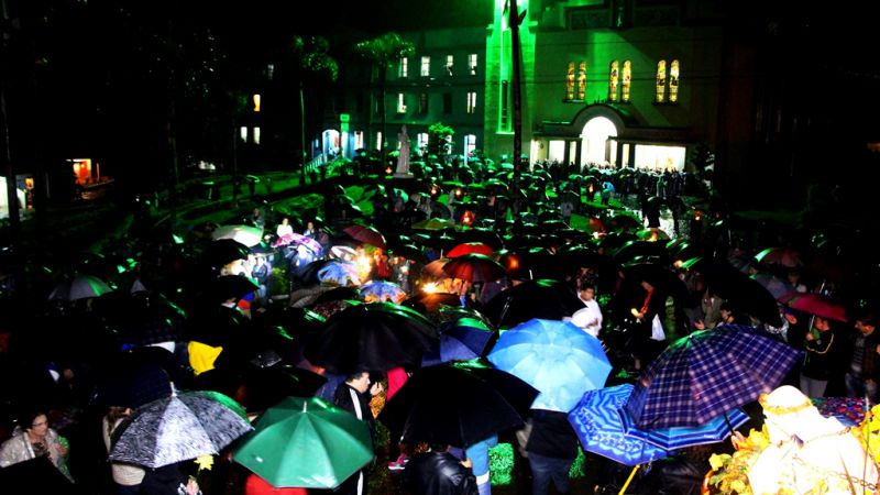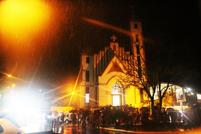 27/09/2015 A chuva não deu trégua na noite deste sábado (26) e a procissão luminosa da Romaria de Nossa Senhora da Salette de Marcelino Ramos (RS) foi realizada em meio a muita água. Aos poucos os devotos foram se aglomerando em frente a Igreja Matriz da cidade de onde saiu a procissão por volta das 20h rumo ao Santuário. Além das velas e tochas, o guarda-chuva foi item obrigatório na caminhada santa. Pelas ruas eles seguiram superando os obstáculos impostos pela mãe natureza. No trajeto muita lama, barro mas a certeza de que o objetivo seria alcançado apesar de todas as dificuldades.