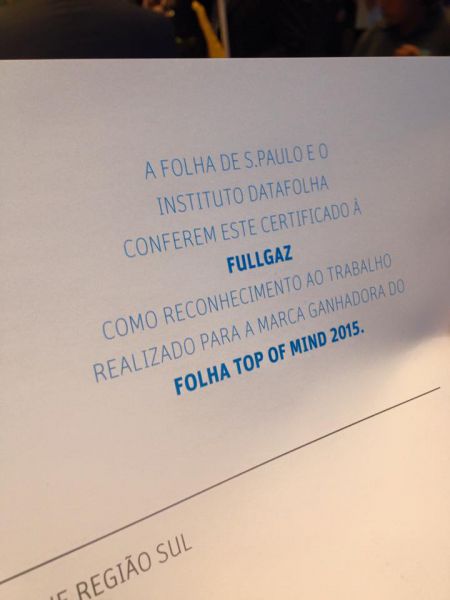 28/10/2015 Na última segunda-feira, 27 de outubro, a agência Fullgaz, com sede em Joaçaba e Joinville, foi premiada no Top of Mind 2015 da Folha de São Paulo, pelas estratégias desenvolvidas para o seu cliente Tirol, fazendo dele, a marca destaque da Região Sul na pesquisa. Sem dúvidas um grande presente para a agência, que no último dia 20, comemorou o seu aniversário de 15 anos.