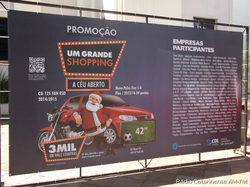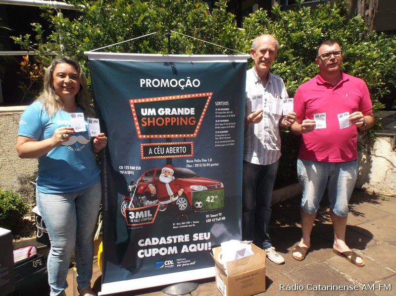 O próximo sorteio da promoção “Um Grande Shopping a Céu Aberto” acontecerá no dia 28 de novembro e terá como brindes 5 vales-compra no valor de R$ 200,00 cada e mais um televisor de 42 polegadas, sendo que o sorteio final será no dia 23 de dezembro com 5 vales-compra no valor de R$ 200,00 cada, uma motocicleta CG 125 Fan e um automóvel Pálio 1.0 flex, 4 portas.