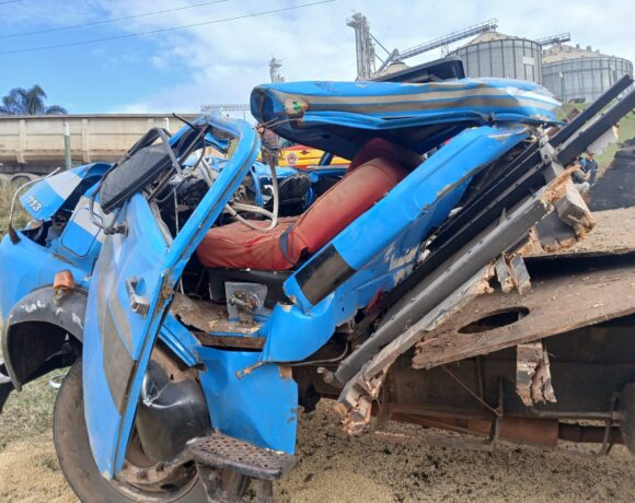Um caminhão carregado com soja tombou e teve a cabine completamente