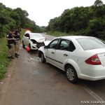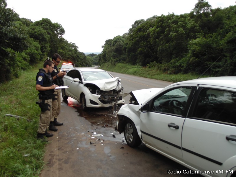 Um acidente envolvendo dois veículos por volta das 17h15min desta sexta-feira (18) mobilizou o SAMU e a Polícia Rodoviária Federal (PRF). Na colisão frontal 3 pessoas, sendo duas num Honda/HB20 de cor branca, placas PAG-3787 de Brasília, conduzido pelo homem de iniciais J.B. de 35 anos e o carona de iniciais R.L.B de 50 anos. O outro veículo, um Ford Fiesta de cor branca placas MHL-0930 de Joaçaba, tinha como condutora B.S.Q. de 20 anos.