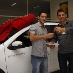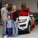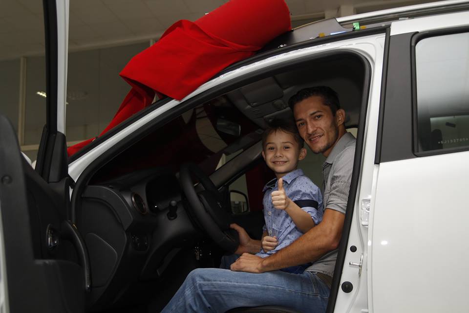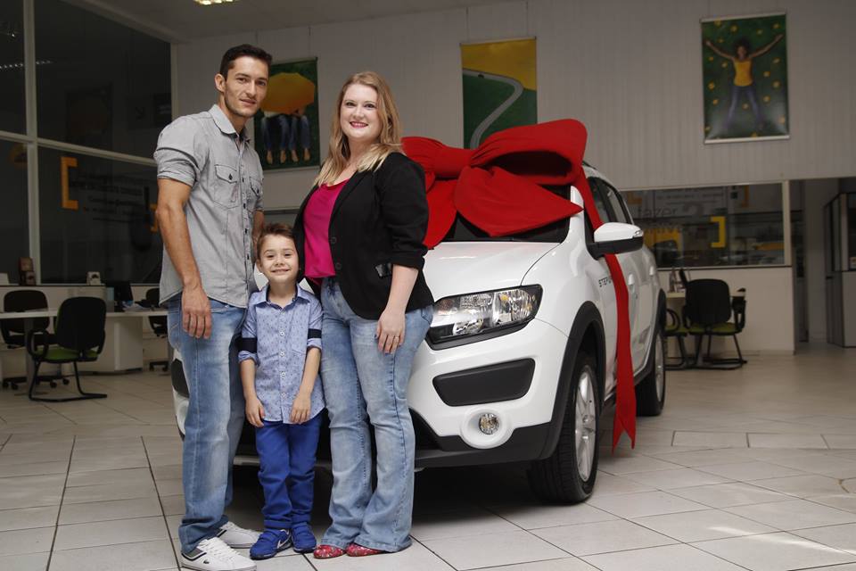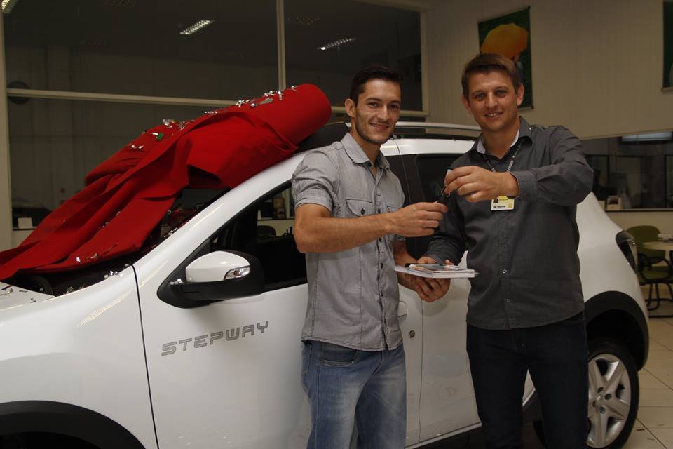 Este ano a sorte estava na De Marco Renault de Joaçaba! Bruno Felipe Celly visitou a De Marco quando levou o filho, o pequeno Isaac de 05 anos, para conhecer o carro de fórmula 1 Renault R30 e acabou participando da promoção. Bruno girou a chave, mas o carro não ligou. Ele preencheu um único cupom para participar do sorteio, e acabou sendo o contemplado: levou um Sandero Stepway 0km pra casa.
