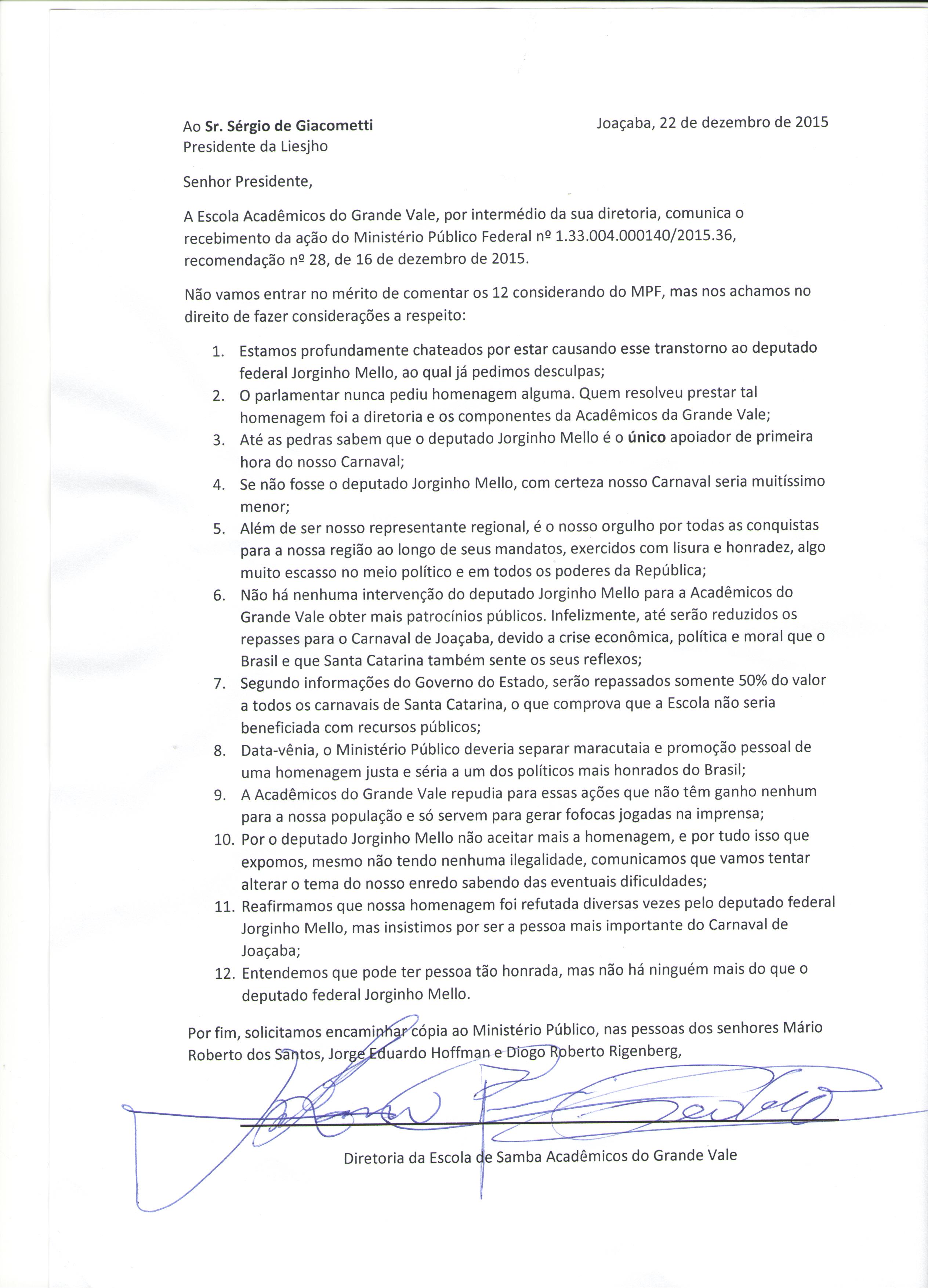 A Escola de Samba Acadêmicos do Grande Vale não vai mais homenagear o deputado Federal Jorginho Mello no Carnaval de 2016. A escola havia lançado o enredo há cerca de dois meses e neste mês de dezembro foi alvo de uma ação do Ministério Público Federal (MPF) que entende que recursos públicos não poderiam ser usados para tal finalidade.