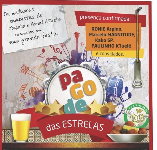 Os melhores sambistas de Joaçaba e Herval d’ Oeste estarão reunidos em uma grande festa no dia 9 de janeiro, na quadra da Aliança. O Pagode das Estrelas, que inicia às 21h, tem a presença confirmada de Ronie Arpino, Marcelo Magnitude, Kako SP, Paulinho K’luelê e convidados.