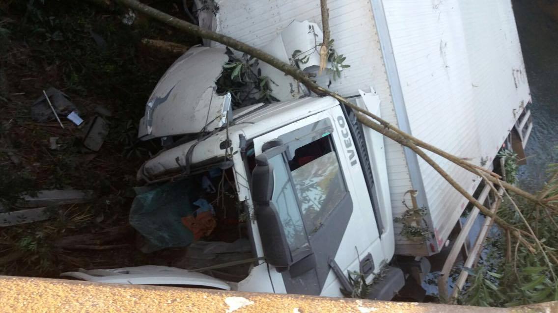 Um caminhão baú despencou da ponte sobre o Rio Jacutinga na BR-282 em Catanduvas. O acidente ocorreu por volta das 7h desta segunda-feira, dia 25. O caminhão tem placas de Videira e o motorista de 43 anos teve apenas ferimentos leves. Os Bombeiros Militares foram acionados para atender a ocorrência e resgataram a vítima. O caminhão teve danos de grande monta, porém o motorista conseguiu se salvar. O caminhão fazia o sentido Vargem Bonita à Catanduvas. A PRF também foi acionada e um equipamento especial será necessário para retirar o caminhão do local. Não é a primeira vez que acidente do gênero é registrado nessa ponte.