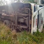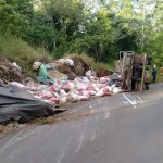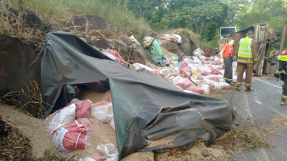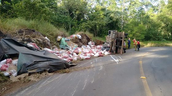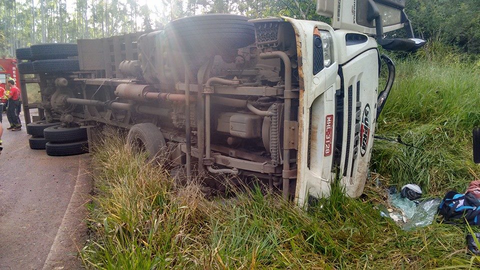 Caminhão com placas de Treze Tilias tombou no acesso a Engenho Velho, interior de Concórdia. Falta de freios pode ter sido a causa. Motorista sofreu ferimentos leves. Muita sorte por não colidir contra paredão de pedras, que poderia ser fatal. Condutos foi atendido pelo Samu.