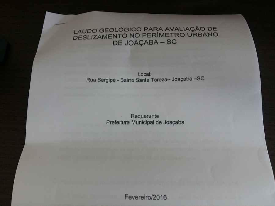 Um laudo feito por um geólogo, entregue nesta quinta-feira (19) na prefeitura de Joaçaba, confirma o risco de deslizamento de terra e pedras numa encosta no bairro Santa Tereza. A área havia sido interditada pela Defesa Civil no início da semana, após a enxurrada, e pelo menos 12 famílias tiveram que deixar suas casas na rua Sergipe. O geólogo Custódio Crippa fez uma vistoria detalhada do local e constatou que a encosta oferece risco aos moradores. Segundo ele, o que provocou a movimentação de terra foi um loteamento implantado nas ruas Ayrton Senna e Valdomiro de Março. “Providências urgentes devem ser tomadas quanto a canalização, o controle das águas deste loteamento que estão sendo descarregadas neste ponto” explicou ele.