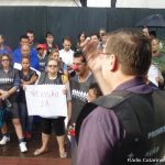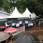 Apesar da chuva, um grupo de servidores da Prefeitura Municipal de Joaçaba esteve presente na praça Adolfo Konder, conforme o anunciado pela direção do Sindicato da classe, para protestar contra a administração, em especial o prefeito Rafael Laske (Mamão), que não sentou com a categoria para resolver o impasse do reajuste salarial.