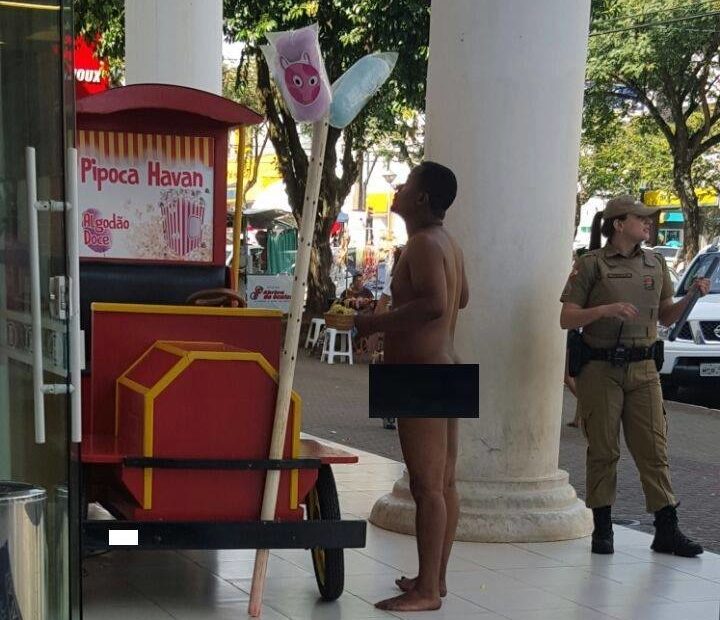 A Polícia Militar prendeu na manhã de sábado, 02, um homem andando nu pelo centro de Chapecó. A guarnição foi acionada por volta das 10h por pessoas que passavam pelo local e afirmaram que o homem estava completamente pelado e caminhava pela Avenida Getúlio Vargas, próximo ao Calçadão da Benjamin Constant. Conforme informações, não é a primeira vez que o mesmo homem, que seria imigrante, é flagrado caminhando nu pelos bairros e área central de Chapecó. Ele foi preso em frente à loja Havan. (Kelly Figueiró)
