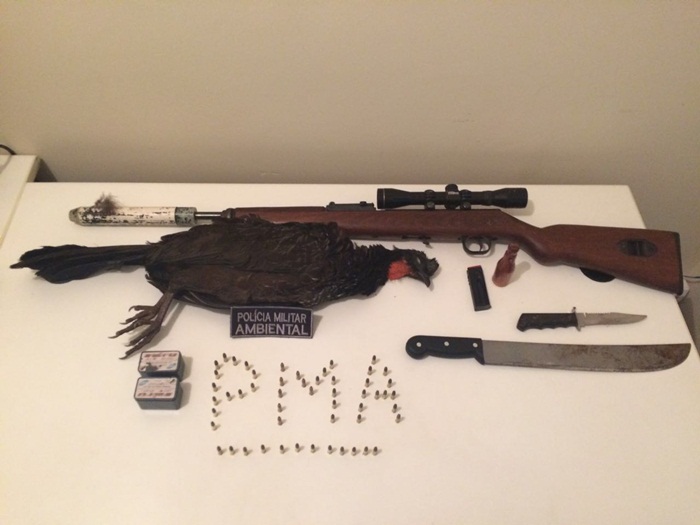 Após uma denúncia anônima os policiais que integram a Polícia Militar Ambiental de Herval d´Oeste, estiveram no interior do município de Ibicaré nesta sexta-feira (1º) e no deslocamento abordaram o veículo Ford Fiesta com um homem dentro, sendo que no banco traseiro os policiais encontraram uma espingarda calibre 22 municiada com luneta e silenciador, e uma mochila, sendo que dentro dela tinha uma ave Jacu abatida, duas facas, um apito para chamarisco dos animais e 53 munições intactas.