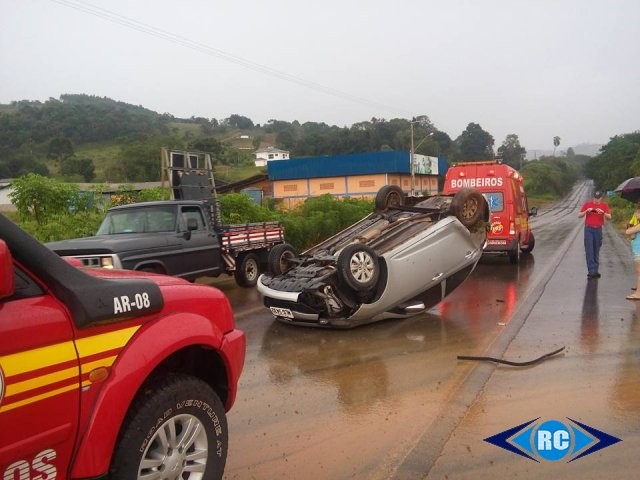Um Hyundai HB20, placas MBL-3432 de Capinzal, capotou por volta das 13h40min desta quinta-feira (14) na SC-150, próximo ao Eros Motel, entre Ouro e Lacerdópolis. De acordo com informações, o veículo rodou na pista após aquaplanar, bateu no barranco e depois capotou.