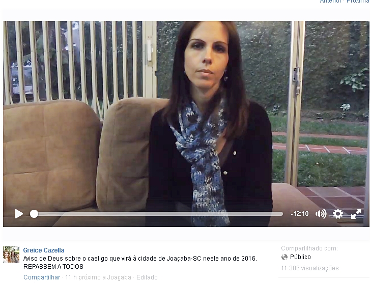 Gracie Cazella disse que há cerca de dois anos se converteu a partir do que ela considera fatos assustadores que estariam acontecendo na casa onde mora. Sem revelar detalhes, ela disse que a partir deste momento decidiu procurar ajuda em uma Igreja que passou frequentar e ler com mais frequência a bíblia. No vídeo ela diz que Deus começou a falar com ela e que neste mês de maio mandou uma mensagem em forma de alerta para a região de Joaçaba. Lendo um texto em frente a uma câmera ela fala em grande destruição através de pedras que rolarão morro abaixo. “Fiquei muito triste a apavorada quando li e dai entrei em oração” cita ela em um determinado momento do vídeo. O motivo desta destruição seria os pecados e as adorações a ele. “O povo é incrédulo isso vai acontecer e não será adiado” cita a autora do vídeo.