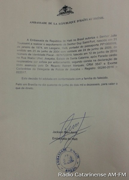 O documento assinado pelo embaixador do Haiti, Jackson Bien-Aime, autoriza o primo da vítima a realizar o sepultamento.