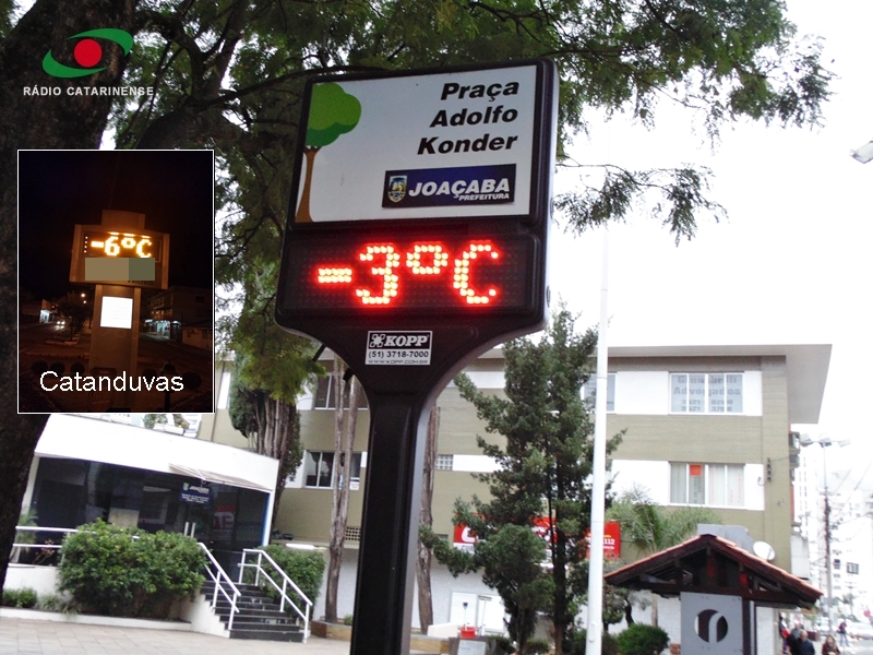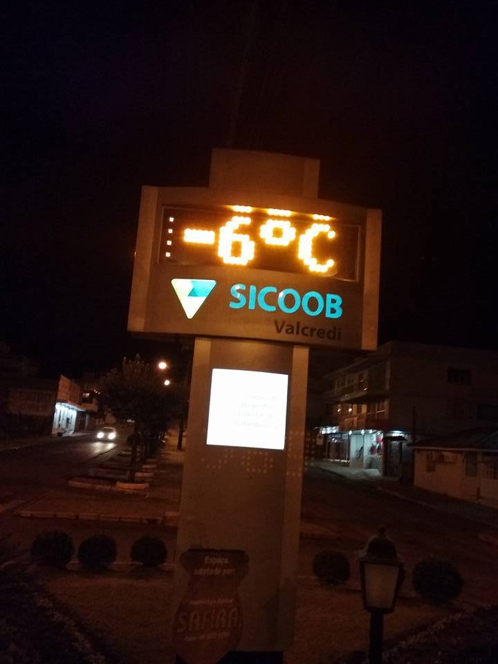 No município de Catanduvas, conforme foto registrada por um ouvinte da Rádio Catarinense, o termômetro localizado na área central da cidade, chegou a -6 graus por volta das 05h.