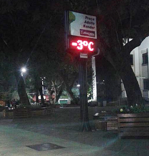 O termômetro da praça Adolfo Konder em Joaçaba, que nesta época do ano ganha espaço nos noticiários, registrou no início da manhã temperatura de -3 graus. Há relatos nas redes sociais, de pessoas que passaram pela XV, que na madrugada a temperatura chegou a 5 graus abaixo de zero.