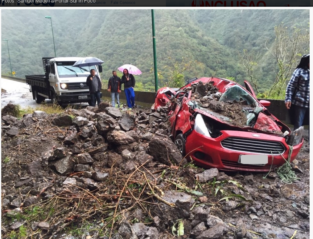 A queda de uma barreira com rochas e terra destruiu totalmente um carro que trafegava pela SC-390, trecho da Serra do Rio do Rastro em Lauro Müller. O fato ocorreu por volta das 12h30min, no km 408, próximo ao mesmo local onde dois outros deslizamentos foram registrados desde o início do ano na rodovia. Mesmo com o grave acidente, no veículo Ford Ka Sedan com placas de São Ludgero, o motorista sofreu apenas escoriações leves e foi socorrido pelo Corpo de Bombeiros de Orleans. A vítima foi encaminhada ao Hospital Henrique Lage de Lauro Müller. Populares ajudaram a desobstruir a via que neste momento encontra-se em meia pista e com congestionamento em ambos os sentidos. Conforme a Polícia Militar rodoviária (PMRv) do Guatá, orienta aos motoristas que não trafeguem pelo trecho neste momento. A chuva e o vento persistem no local.