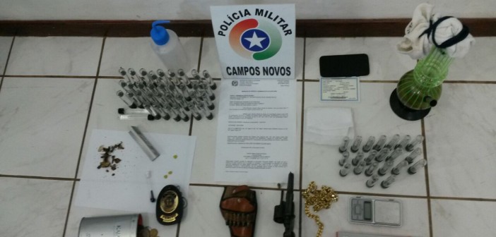 Durante o cumprimento de mandado de prisão em desfavor de jovem de 22 anos, pelo crime de Tráfico de Drogas, expedido pela Comarca de Florianópolis, a Polícia Militar de Campos Novos encontrou na residência dele uma série de materiais ilegais.