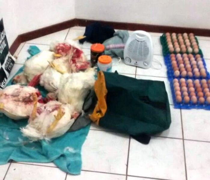 Ao efetuar buscas no veículo VW/GOL, placas CJD-6320 de Campos Novos, foram encontradas várias sacolas com aves abatidas (frango), três bandejas de ovos de galinha (7,5 dúzias), uma sacola com vários produtos de higiene e um aparelho de aquecedor elétrico. O morador do local reconheceu os produtos que haviam sido furtados de um aviário onde o mesmo é funcionário.