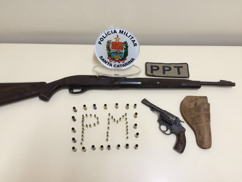 No local os policiais do Pelotão de Patrulhamento Tático (PPT) encontraram e apreenderam uma espingarda cal. 22 sem registro e um revólver cal. 38 com registro vencido, além de algumas munições.