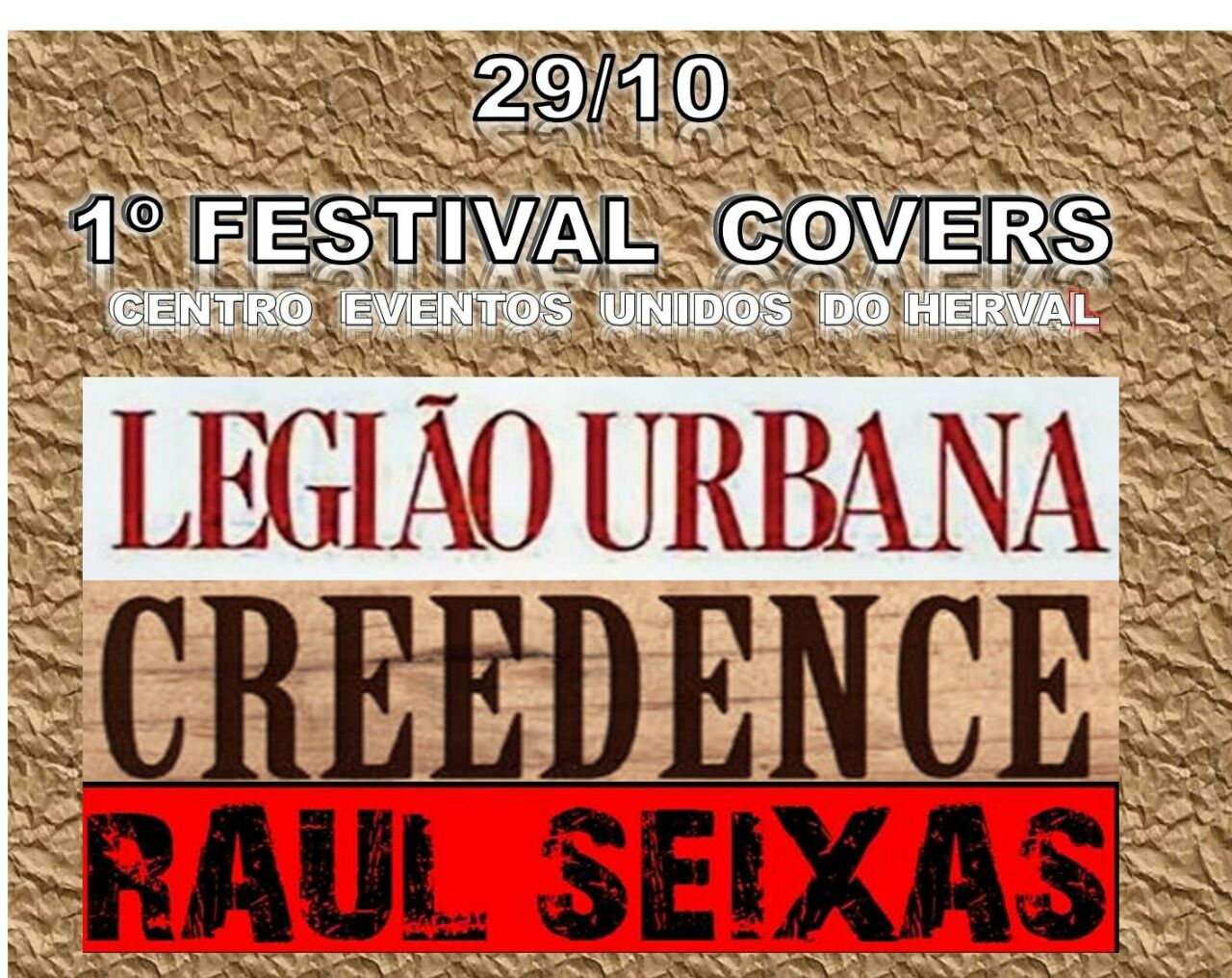 Dia 29 de outubro, no Centro de Eventos da Unidos do Herval acontece o PRIMEIRO FESTIVAL COVER e uma das bandas a se apresentar será LEGIÃO URBANA COVER com sede em Curitiba que tem viajado pelo Brasil  cantando os grandes sucessos que continuam e vão continuar tocando nas rádios e tvs por muito tempo .
