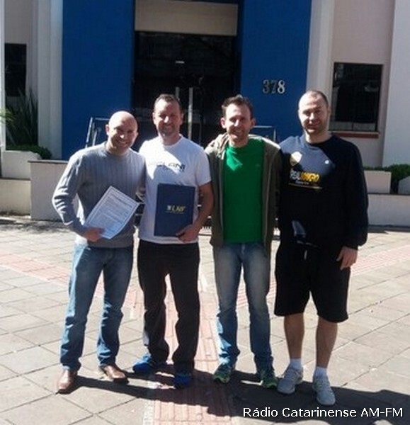 Diretoria do Joaçaba Futsal com representante da Jaclani Esportes logo após a assinatura do contrato de 3 anos