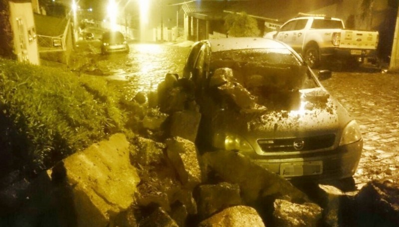 As fortes chuvas da tarde desta terça-feira (25) trouxeram prejuízo ao proprietário do veículo Corsa Hatch, que transitava por volta das 19h na rua Floriano Peixoto no centro do município de Joaçaba. Isso porque, um muro acabou cedendo e caindo sobre o veículo que passava pelo local.