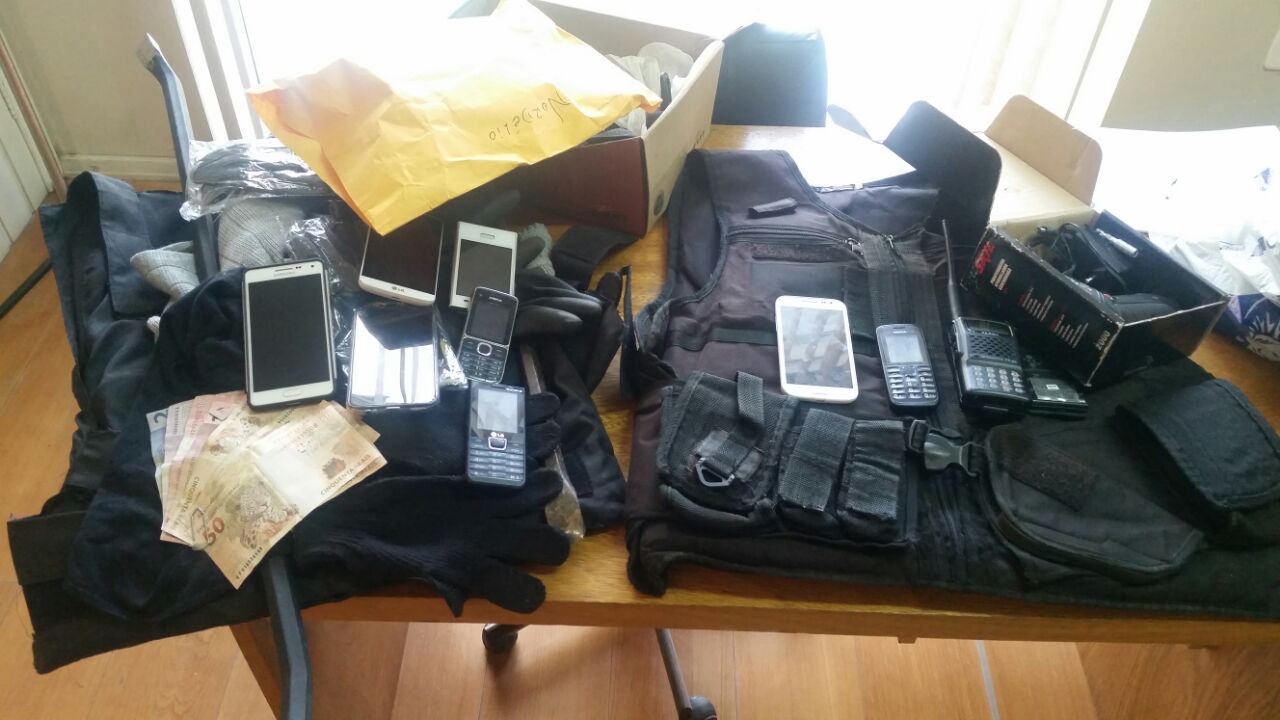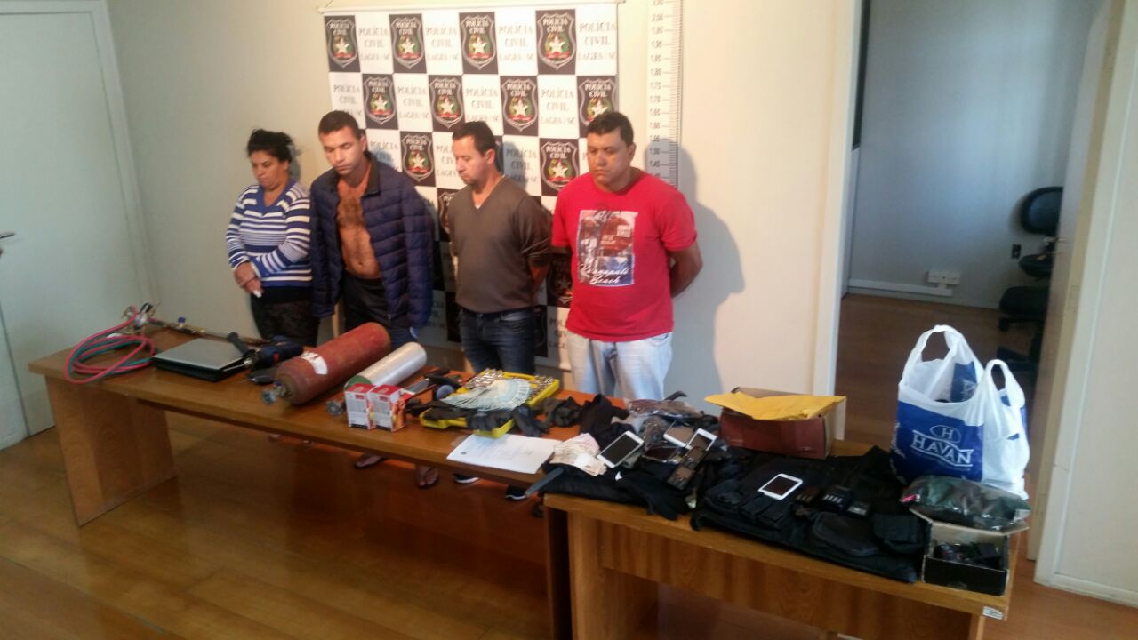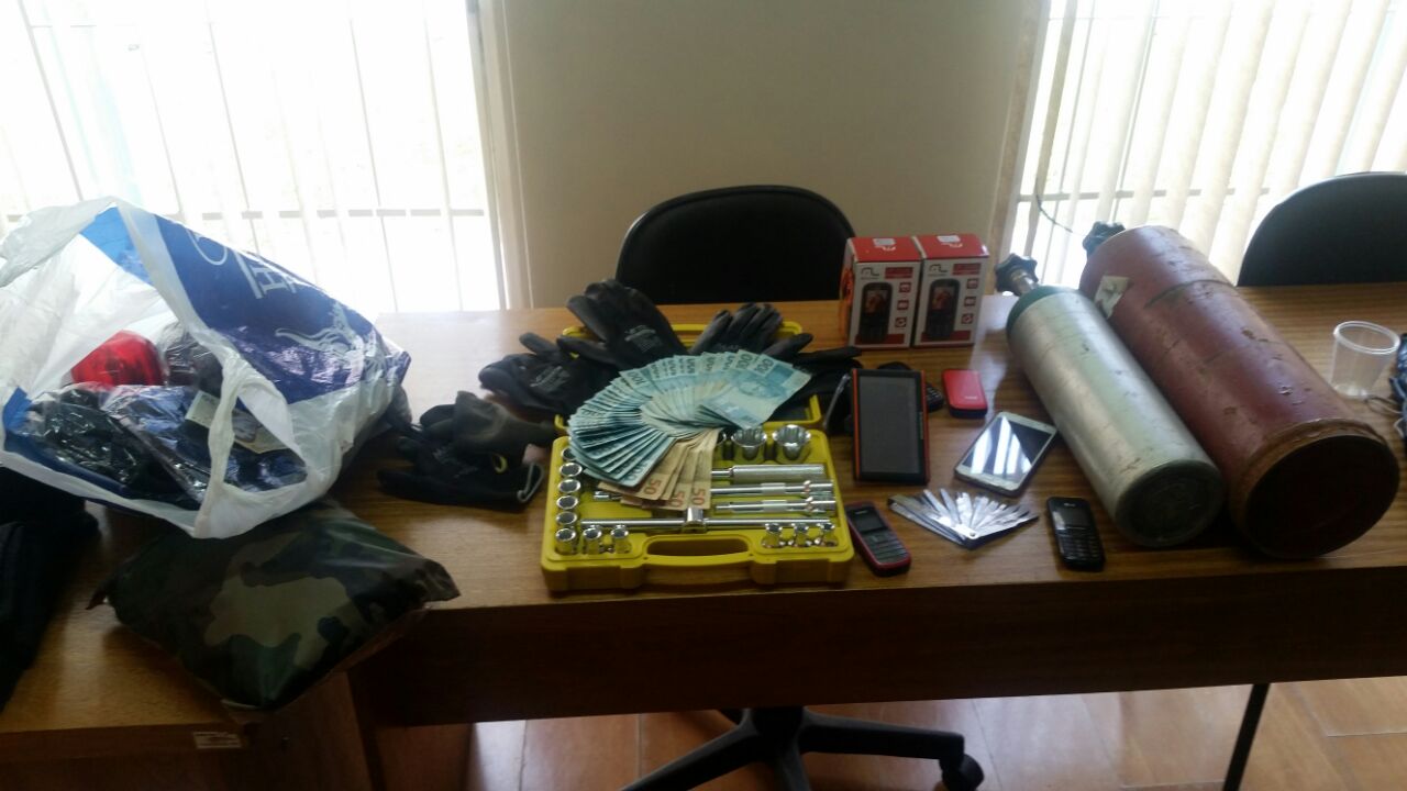 Foram apreendidos dois coletes balísticos, rádios comunicadores, aproximadamente R$6.000,00 em dinheiro, celulares, apetrechos para arrombamento de cofres (cilindros, maçaricos, furadeiras, lixas e diversos pares de luvas), balaclavas e notebooks.
