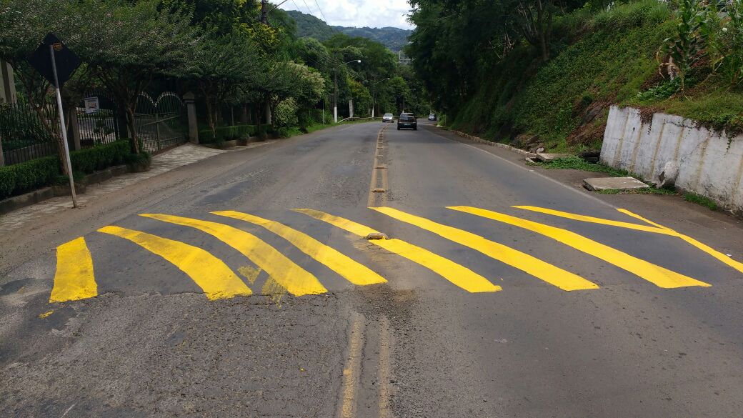 O segundo: pinturas de faixas alertando a existência de lombadas físicas, trabalho realizado por pessoas não qualificadas para tal e sem orientação.