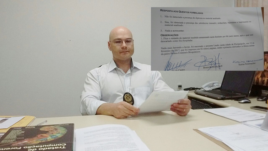 O gerente da Mesorregião do IGP, João Barneche, conduziu a entrevista coletiva. Ele explicou que foi coletado sangue da vítima e encaminhado ao laboratório de Florianópolis para análise a fim de identificar a substância. Foi optado pelo laboratório na capital pela estrutura em se tratando de tecnologia. Três peritos analisaram as amostras de sangue. Segundo consta no laudo, não foi encontrado traços da substância Dipirona no sangue. De acordo com João Barneche isso demostra e comprova que não foi ministrado este medicamento, como alegou o hospital em sua defesa. O exame foi repetido três vezes, por especialistas diferentes, com os resultados sendo confrontados.