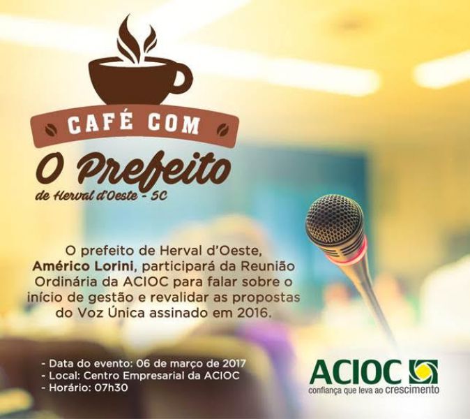 E o primeiro convidado será Américo Lorini, prefeito eleito de Herval d’Oeste. “Nosso objetivo é o de conhecer a situação financeira do município, o modelo de gestão que está sendo implantado e a expectativa para o futuro de Herval d’Oeste. Na oportunidade, reforçaremos a execução das prioridades elencadas no Documento Voz Única e que foram assinadas pelo então candidato a prefeito no dia 09 de setembro de 2016”, explicou Tânia Durigon, presidente da ACIOC.