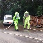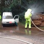 Mesmo com todas as dificuldades e também com a colaboração da chuva, o pessoal conseguiu de uma maneira profissional fazer a contenção dos produtos perigosos dentro dos protocolos, sem levar contaminantes para a nossa ambulância e os hospitais. E na sequência, conseguiram desencarcerar rapidamente as pessoas que estavam presas no carro capotado”, resumiu o tenente Franz do Corpo de Bombeiros que comandou a operação.