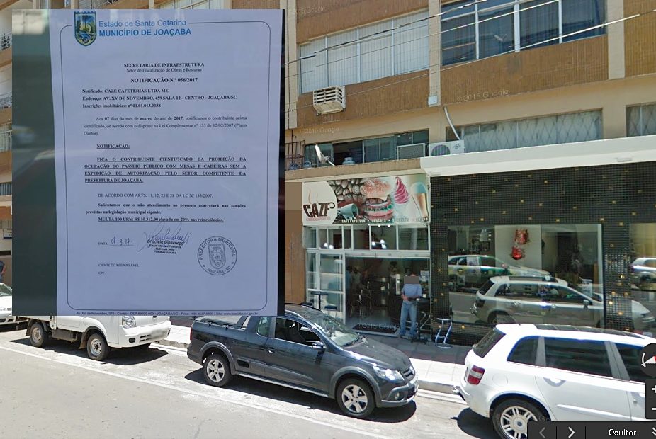 O setor de fiscalização da Secretaria de Infraestrutura da Prefeitura de Joaçaba notificou nesta quarta-feira (08) a Cafeteria localizada na XV de Novembro, no edifício Pedrini. A Cafeteria estava usando o passeio público para colocar mesas e cadeiras para seus clientes. O estabelecimento funciona naquele local há cerca de 20 anos. Na notificação a prefeitura alerta que trata-se de uma prática proibida e que só pode ser permitida mediante autorização expedida pelo setor competente. A multa pelo descumprimento é de R$ 10.312,00.