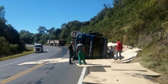 Uma carreta tombou e o motorista ficou ferido na BR-153, em Vargem Bonita nesta sexta-feira, 28. A Polícia Rodoviária Federal (PRF) de Água Doce e o Corpo de Bombeiros de Irani foram acionados para atender o acidente.