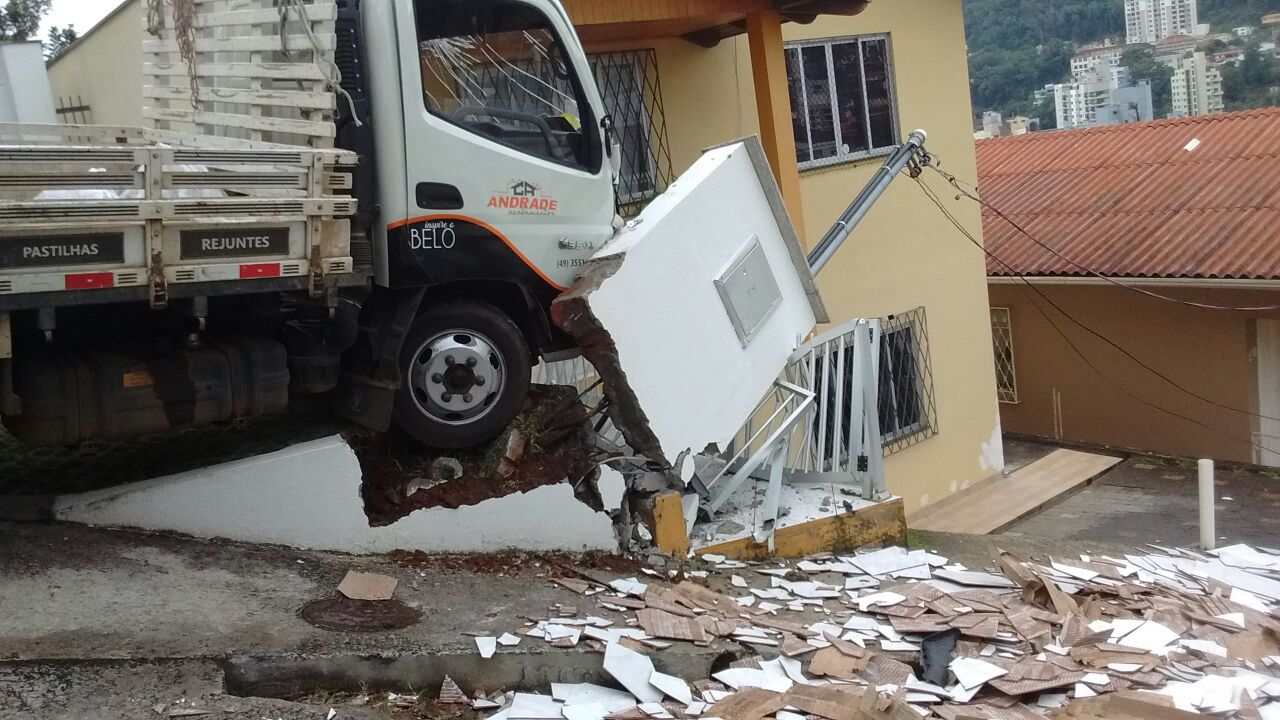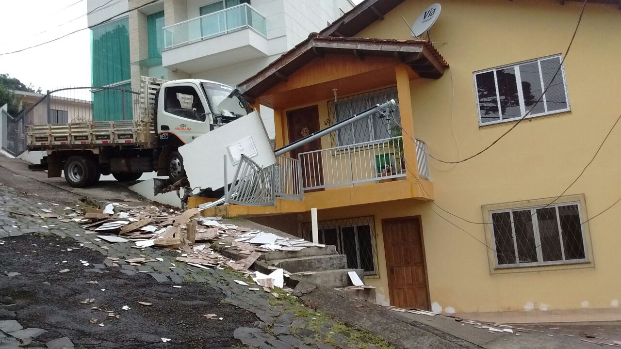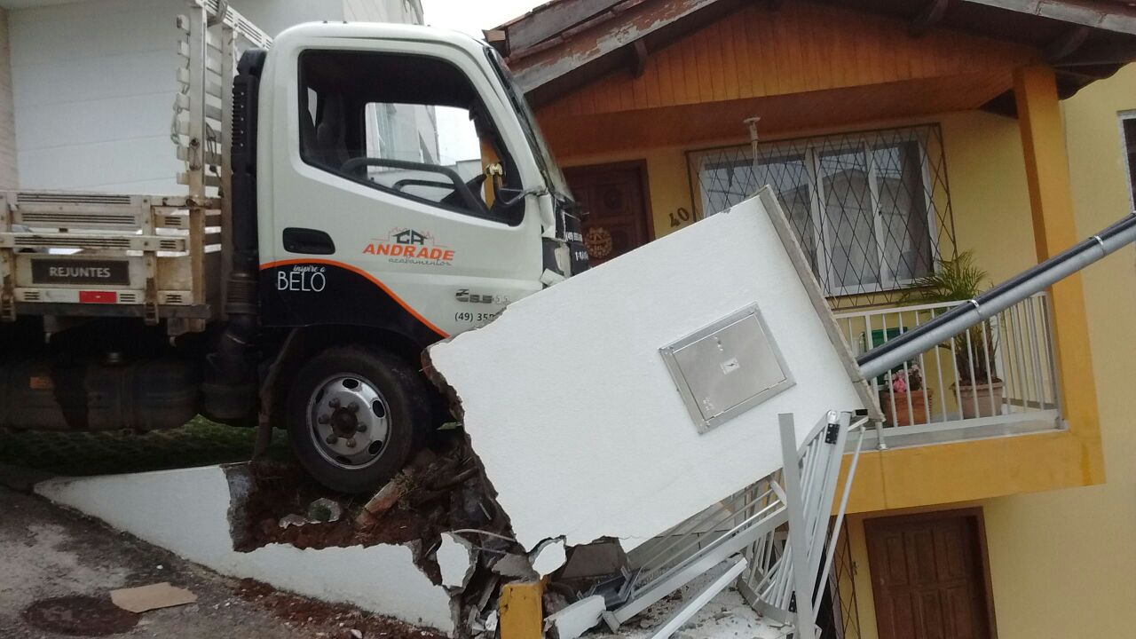 Um caminhão atingiu um carro e depois uma residência na rua Guilherme Zamoner em Joaçaba na manhã desta terça-feira (23). O motorista relatou a Rádio Catarinense que estava descarregando materiais de construção quando o , que estava com freio de mão puxado e com pedras nas rodas, começou deslizar. O ajudante, que estava na carroceria, saltou de cima e o caminhão desceu ladeira abaixo atingindo um padrão da CELESC de uma residência e também uma cerca. O motorista acredita que o calçamento molhado, em razão da chuva, contribuiu para o acidente que resultou apenas em danos materiais. “Ainda bem que ela não desceu reto aqui na rua., senão seria pior ainda” comentou ele. O caminhão tem placas de Herval d’Oeste.