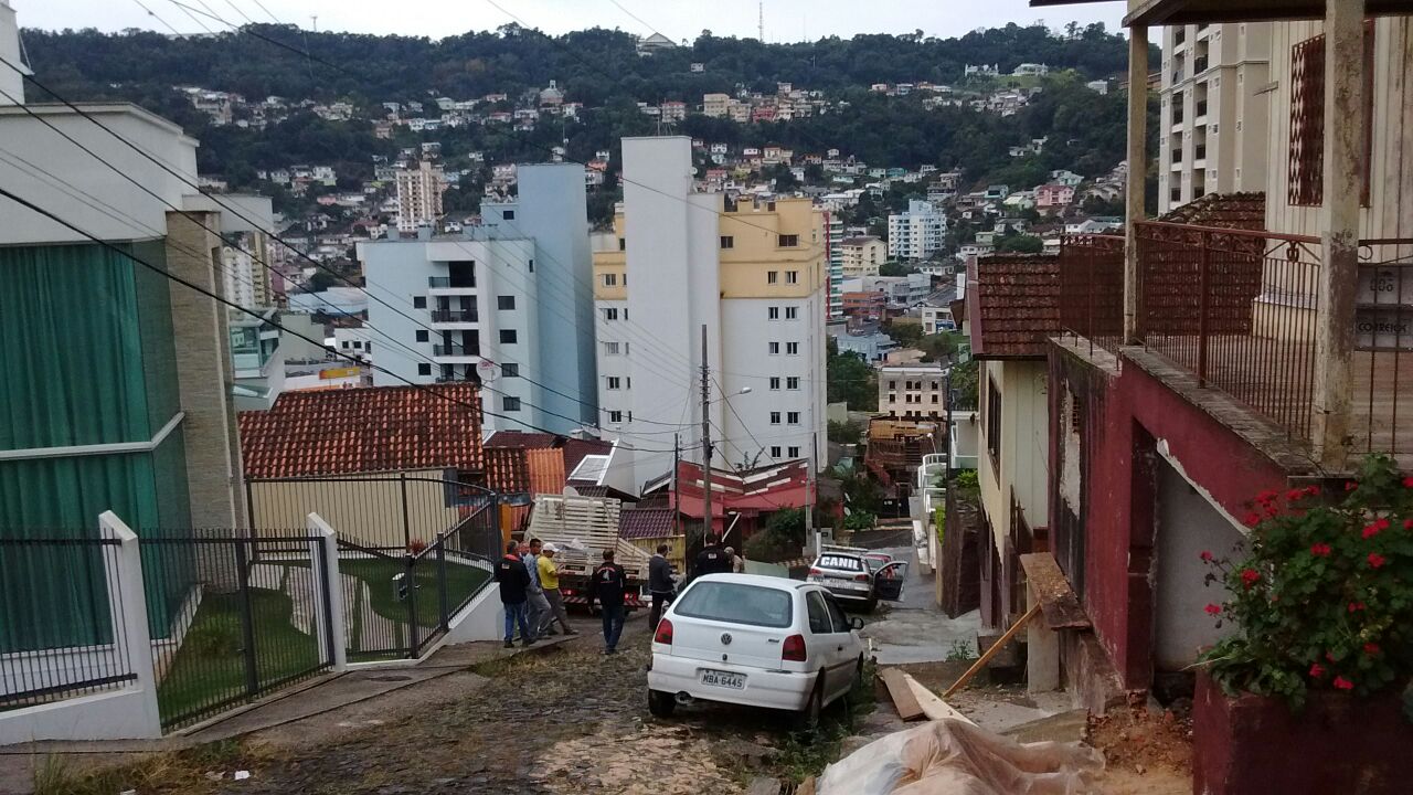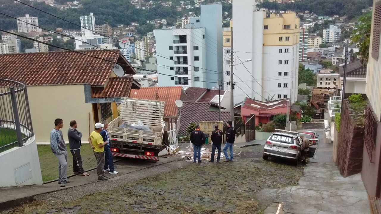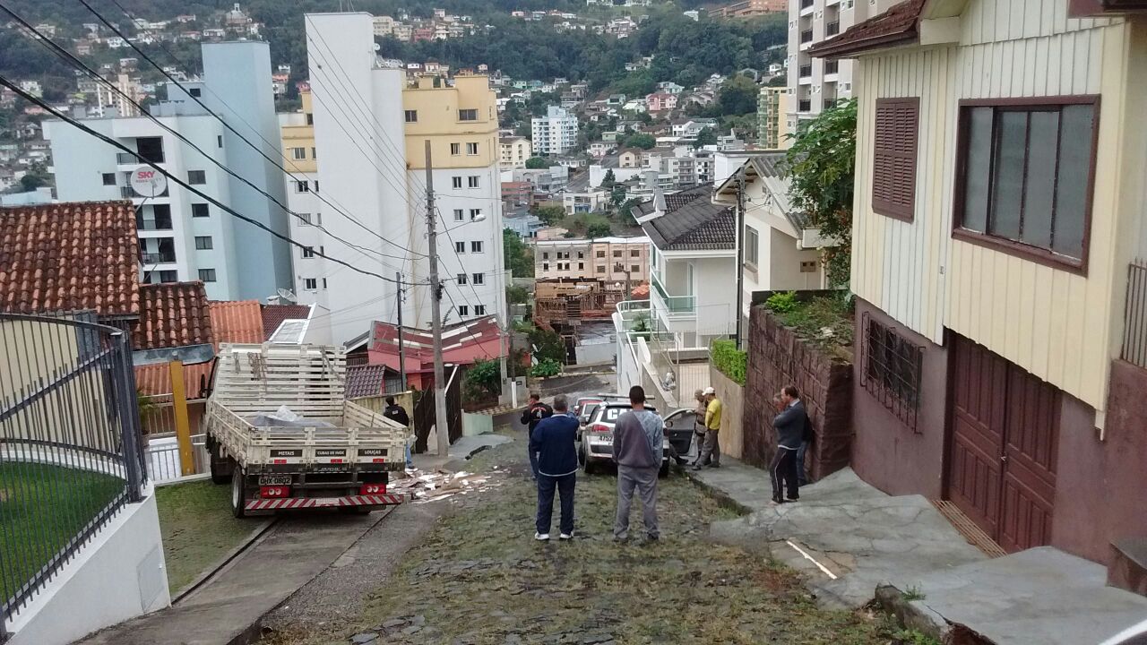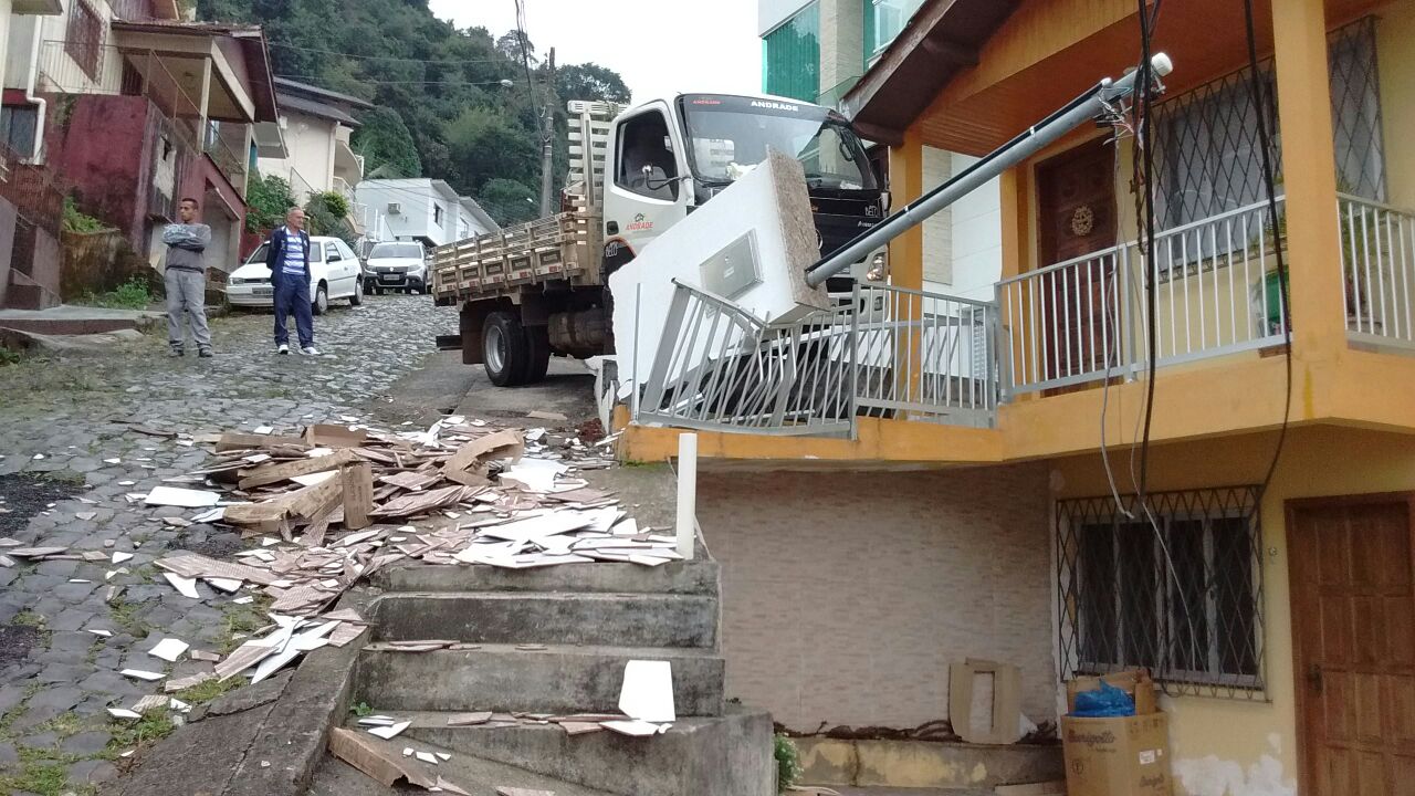 Um caminhão atingiu um carro e depois uma residência na rua Guilherme Zamoner em Joaçaba na manhã desta terça-feira (23). O motorista relatou a Rádio Catarinense que estava descarregando materiais de construção quando o , que estava com freio de mão puxado e com pedras nas rodas, começou deslizar. O ajudante, que estava na carroceria, saltou de cima e o caminhão desceu ladeira abaixo atingindo um padrão da CELESC de uma residência e também uma cerca. O motorista acredita que o calçamento molhado, em razão da chuva, contribuiu para o acidente que resultou apenas em danos materiais. “Ainda bem que ela não desceu reto aqui na rua., senão seria pior ainda” comentou ele. O caminhão tem placas de Herval d’Oeste.
