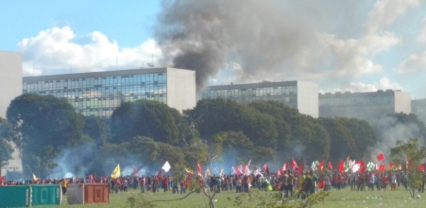 A Polícia Militar do DF usou bombas de gás lacrimogêneo para evitar que manifestantes se aproximem do Congresso Nacional nesta quarta-feira (24). A Marcha das Centrais Sindicais, como está sendo chamado o ato, protesta contra as reformas propostas pelo governo federal e pede a renúncia do presidente Michel Temer. Por volta das 15h30, os prédios dos ministérios da Fazenda e da Agricultura foram incendiados. Todos os prédios da Esplanada estão sendo evacuados neste momento. Os manifestantes se reuniram pela manhã em frente ao estádio Mané Garrincha e depois seguiram em caminhada até o Congresso passando pela Esplanada dos Ministérios. A confusão começou quando os manifestantes tentaram furar uma barreira feita pela polícia para se aproximar do Congresso.