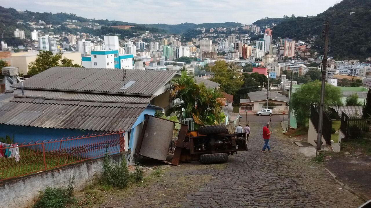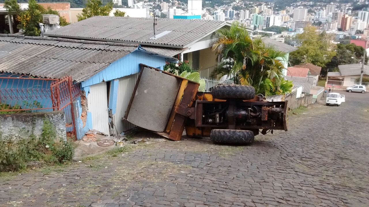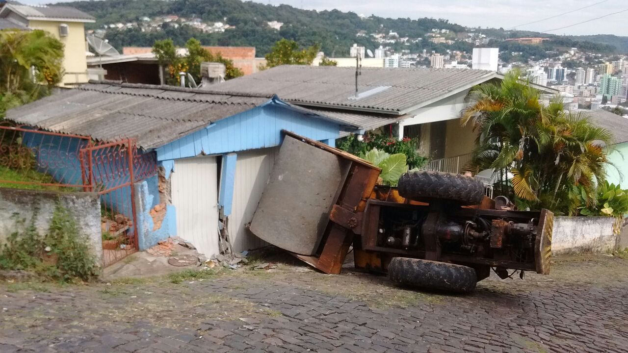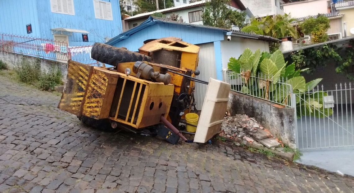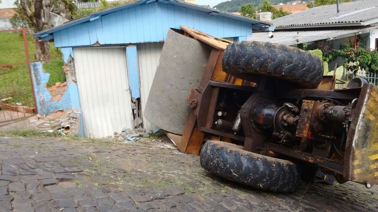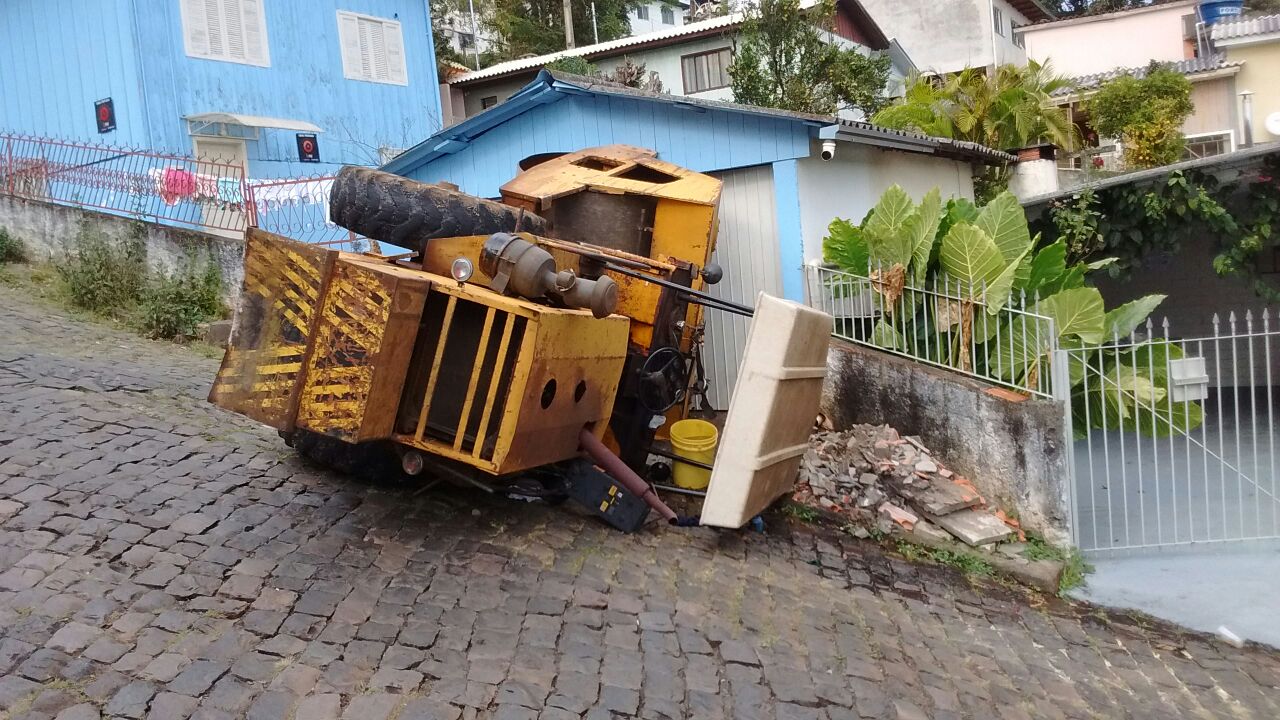 O operador de um rolo compressor, equipamento pesado usado para compactação, levou um grande susto na manhã desta sexta-feira em Herval d’Oeste. Ele estava trafegando pela rua Atílio Valmórbida quando o equipamento tombou, atingindo a garagem de uma residência. O operador sofreu ferimentos leves.