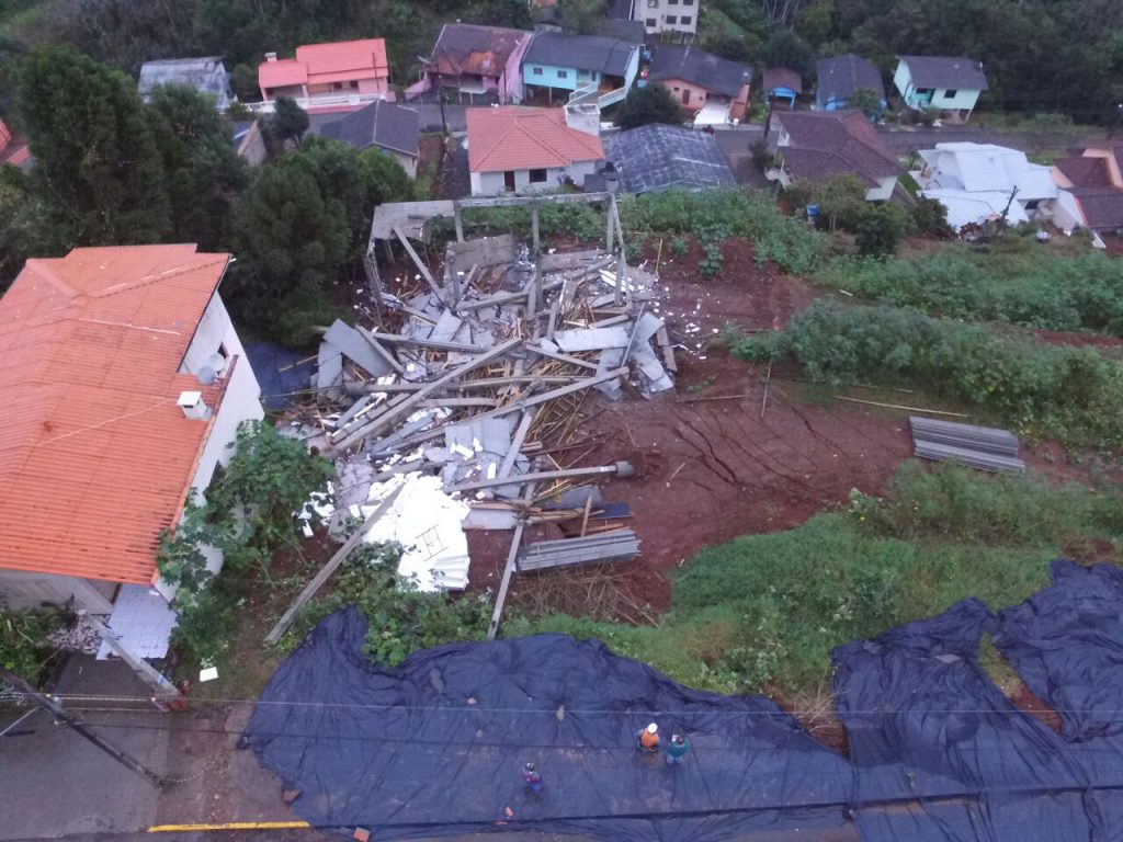 Os pilares de sustentação do prédio em construção acabaram também se movimentando devido ao deslizamento. Depois de praticamente sete dias houve a queda completa da estrutura. (fotos Drones Filmagens Aéreas/Gilmar de Oliveira Machado)