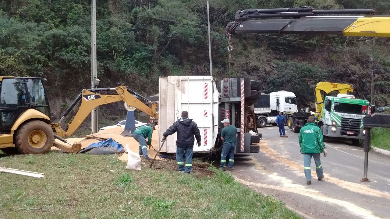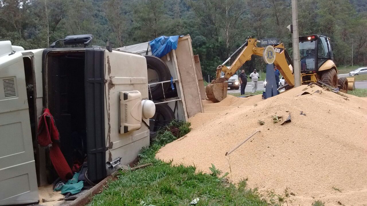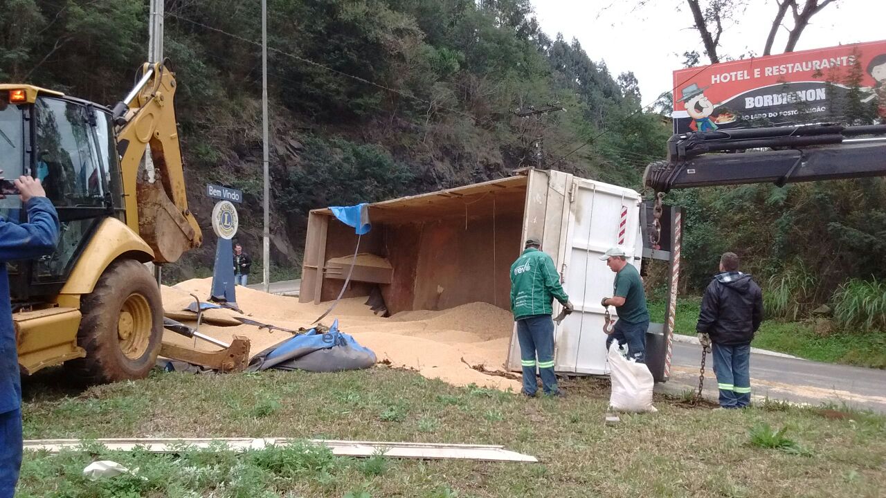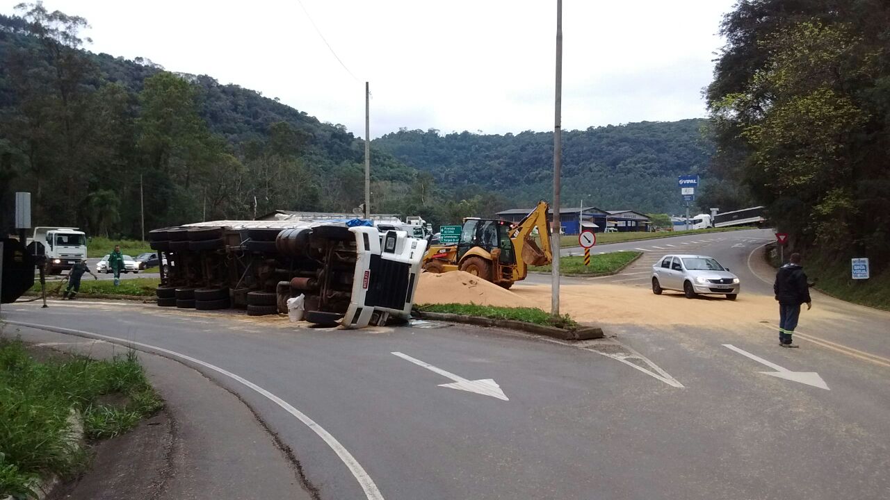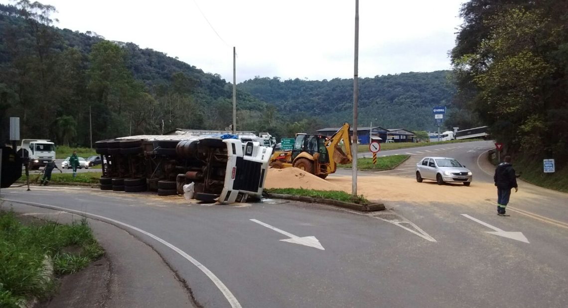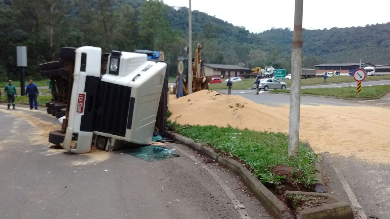 Uma carreta tombou na tarde desta terça-feira (20) no trevo do Chocodinho na BR-282 em Joaçaba. O acidente aconteceu por volta das 14h30. A carreta, com placas de Capinzal, havia passado pela ponte da BR (Alfredo Ítalo Remor) quando tombou ao tentar acessar a avenida Santa Teresinha. A carga ficou esparramada no canteiro e na pista. Bombeiros e a Polícia Rodoviária Federal prestaram atendimento, principalmente na limpeza da pista e na orientação do trânsito que ficou em meia pista. Uma retroescavadeira foi usada para recolher a carga de soja. O motorista do caminhão, que estava sozinho, sofreu lesões leves e foi levado ao HUST.