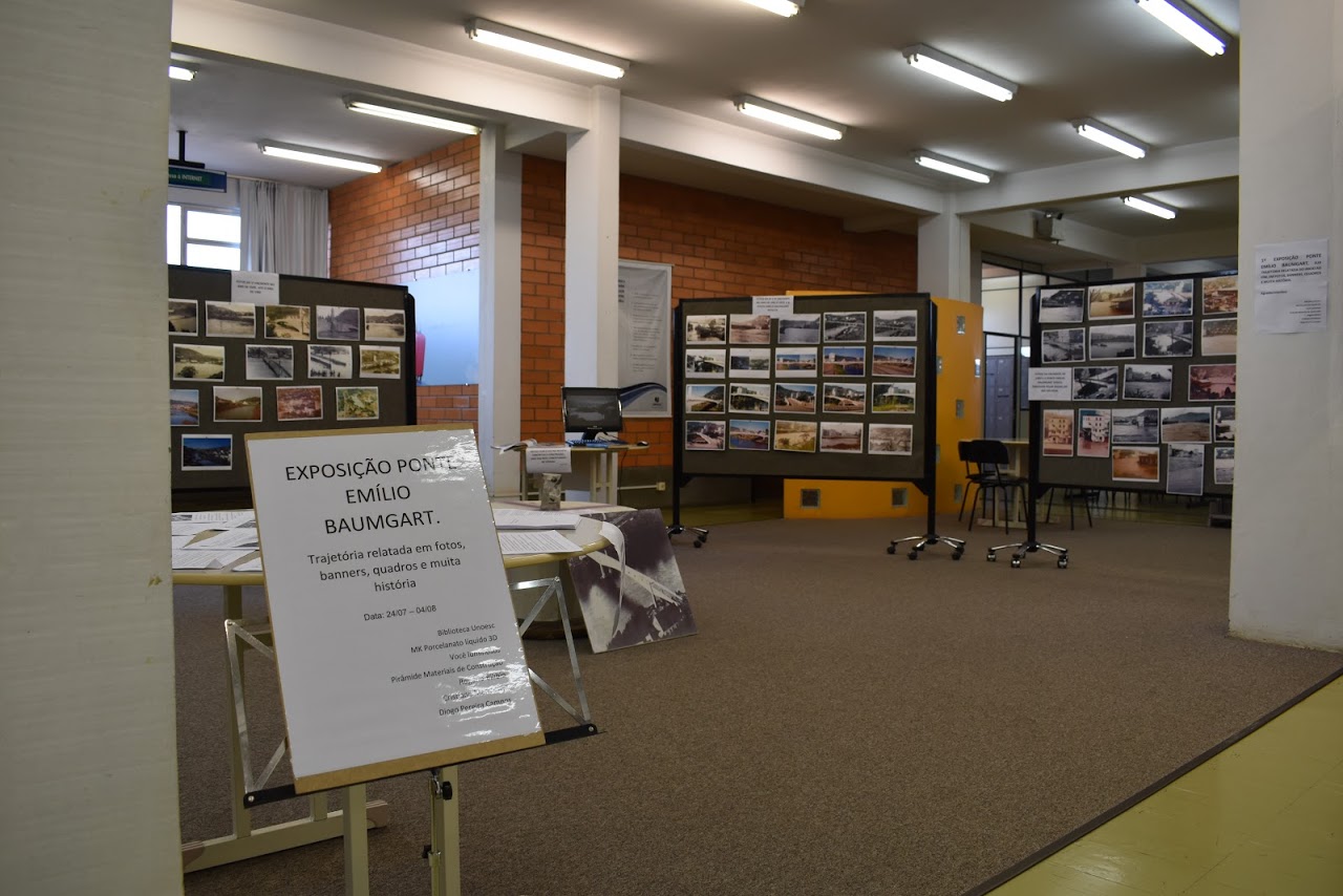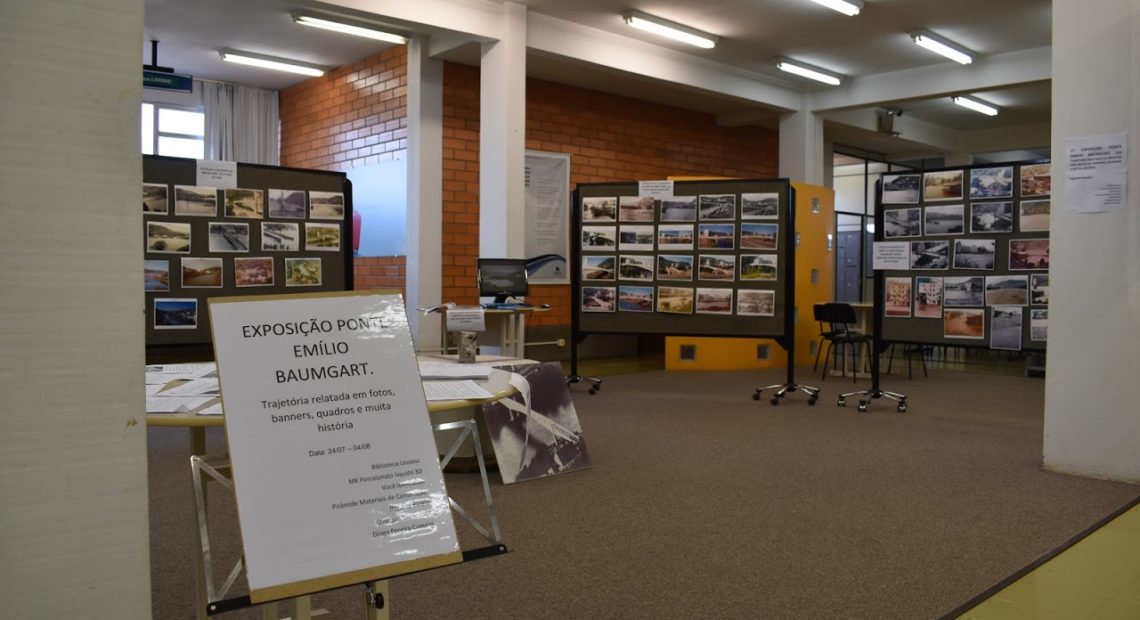A exposição sobre a trajetória da ponte Emílio Baumgart estará na Biblioteca da Unoesc Joaçaba até a próxima sexta-feira, 4 de agosto. Desenvolvida pelo colaborador da Unoesc, Marckson Kielek, a exposição conta com fotografias, banners, vídeos, quadro desenhado por Diogo de Campos, um pedaço pequeno da ponte, mostrando a sua durabilidade, alguns livros, além de uma revista que relata a construção da obra.