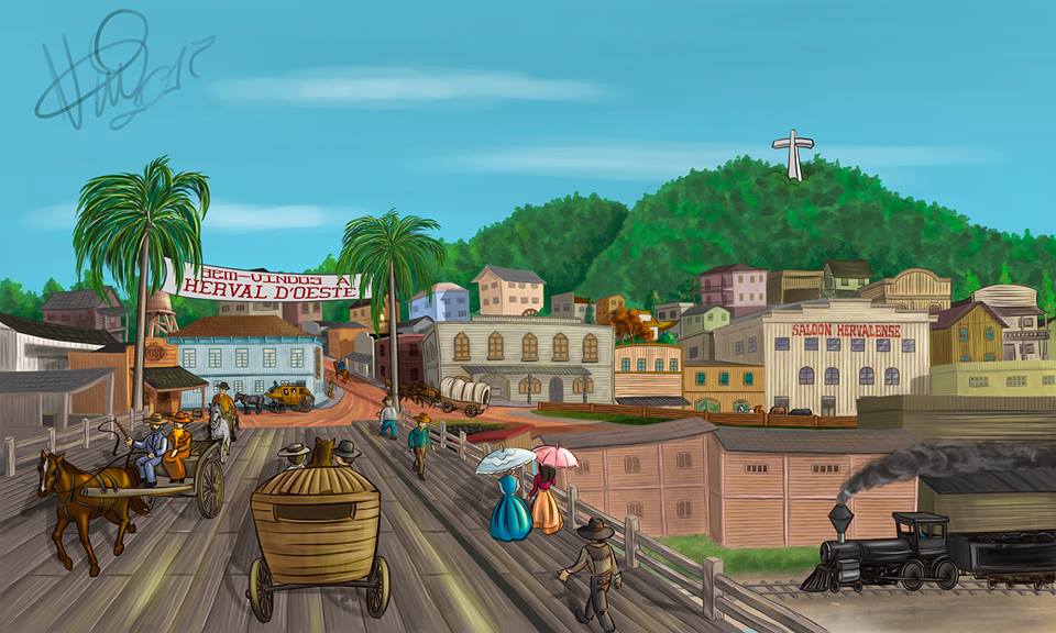 Um hervalense vem se destacando pelo seu talento com ilustrações. Trata-se de Jurandir Correia, que por muitos anos trabalhou na extinta TV Barriga Verde, e agora segue carreira solo trabalhando com artes gráficas. Nesta terça-feira ele postou uma ilustração nas redes sociais que é uma verdadeira obra de arte. Na imagem intitulada por ele “Herval do Velho Oeste” ele proporcionou uma viagem ao passado, mexendo com o imaginário das pessoas. Carruagens fazem a travessia da ponte Jorge Lacerda de madeira com pessoas caracterizadas com roupas da época. A direita o “Saloon Hervalense” e na base da imagem uma Maria-Fumaça.
