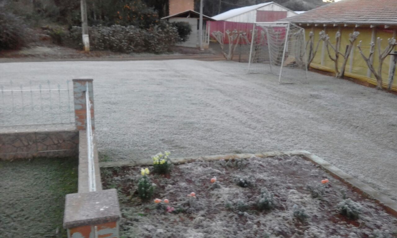 Mais uma manhã gelada nos municípios do Meio-Oeste Catarinense. A quarta-feira (19) amanheceu com temperaturas abaixo de zero. Houve formação de geada na maioria dos municípios da região de Joaçaba. Fotos feitas pelo repórter Paulo César da Rádio Catarinense, na região do distrito de Nova Petrópolis, mostram a intensidade do gelo. Campos, gramados, telhados e lavouras cobertos por uma fina camada de gelo. O frio foi tão intenso que congelou até mesmo água empoçada nas estradas.