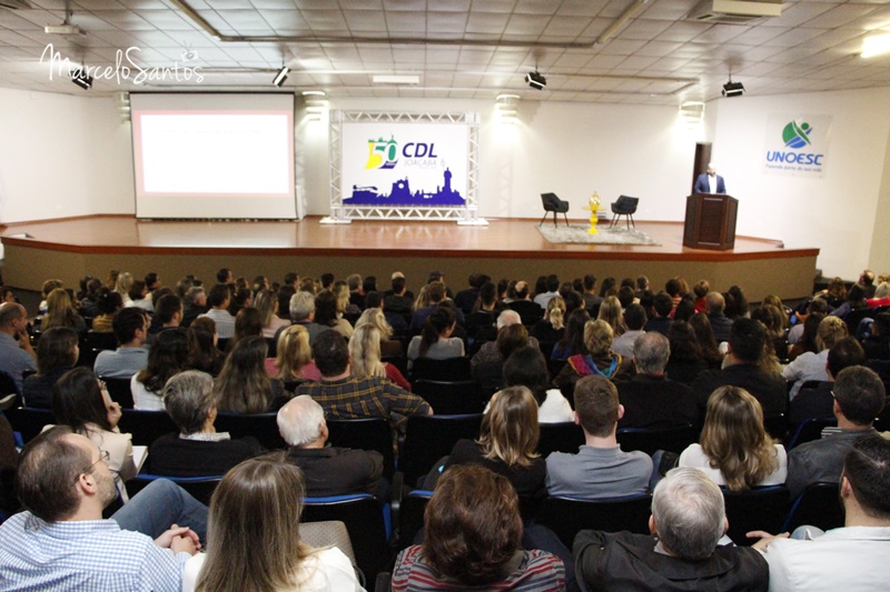 Entre graças, palavrões e citações ousadas, Clóvis de Barros filosofou em Joaçaba sobre a vida e sobre o que o mundo espera de você na ótica de diversos pensadores que mudaram a nossa maneira de ver e viver o mundo. A palestra “A Vida que Vale a Pena Ser Vivida” foi promovida pela Câmara de Dirigentes Lojistas de Joaçaba (CDL) no auditório Afonso Dresch fazendo parte da programação dos 50 anos da entidade. Sua maneira de se expressar estimulou a reflexão sobre dar um sentido a vida, sobre o que realmente vale a pena, relacionando assuntos inerentes a carreira, família e realizações pessoais. Desde o início o estudioso de filosofia deixou bem claro que essas questões só podem ser respondidas por cada um de nós, com base nas nossas experiências, prioridades e afinidades. Clóvis começou a palestra com a pergunta: O que a vida tem de ter para valer à pena? O público atento a cada citação do palestrante refletia a cada raciocínio, mantendo-se atento durante uma hora e meia de oratória, sem qualquer tipo de aparato tecnológico. “Nós seres humanos possuímos todo o potencial para sermos grandes ao nascermos e para isso é preciso que aperfeiçoemos nossas habilidades em busca da excelência” pontuou Clóvis.
