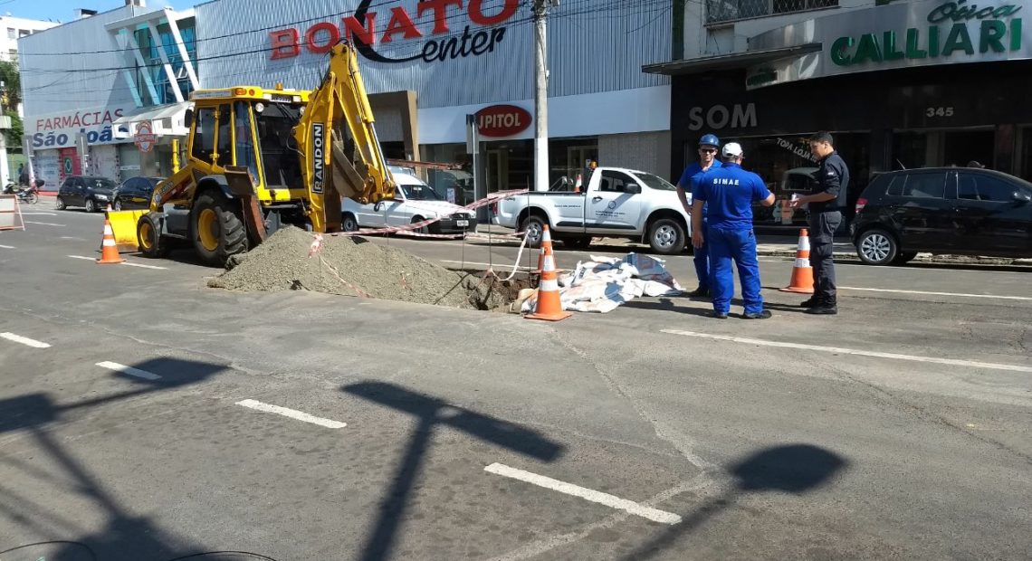 O SIMAE está recuperando uma rede de esgoto na XV de Novembro. O conserto iniciou no final de semana, mas o trabalho demorou um pouco mais que o previsto uma vez que as máquinas acabaram atingindo uma rede de comunicação com cabos de fibra ótica.