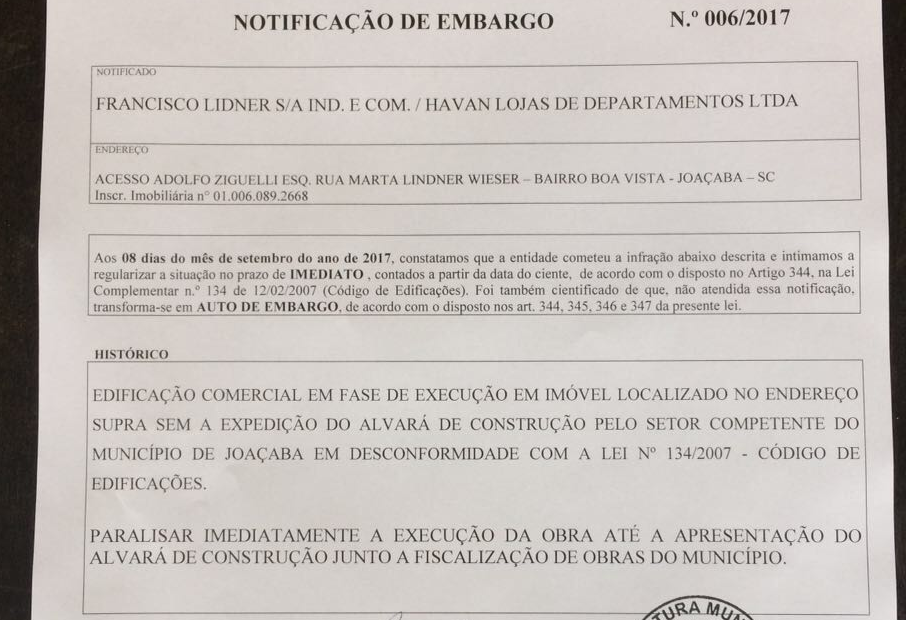 Segundo documento em anexo (Notificação de Embargo), a Havan foi intimada a regularizar a situação, caso contrário, a obra será paralisada imediatamente enquanto o Alvará de Construção expedido pelo setor competente da Prefeitura Municipal de Joaçaba não for apresentado.