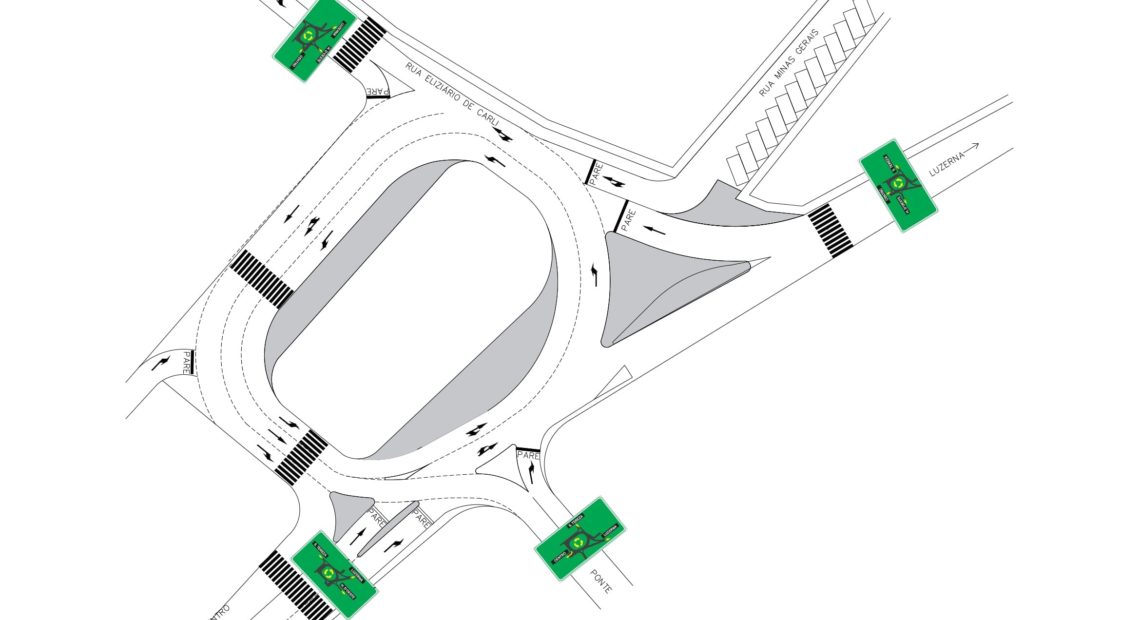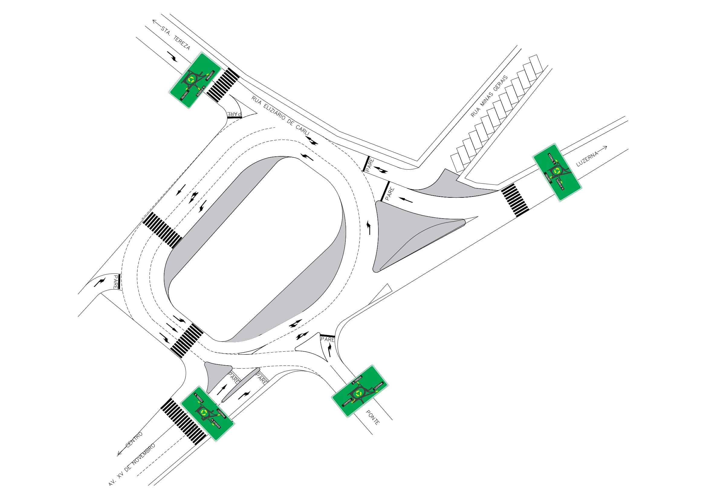 Quem vem da ponte, após dar a preferência para quem está na rotatória, obrigatoriamente, deverá pegar a direita para escolher o sentido Luzerna, entrar no Bairro Santa Tereza ou para ir ao centro de Joaçaba deverá contornar a praça.