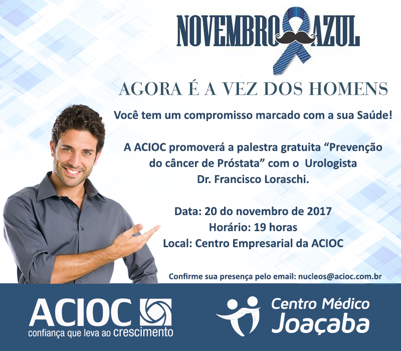 Com a chegada do mês de novembro, dedicado ao cuidado da saúde do homem, a Associação Comercial e Industrial do Oeste Catarinense (ACIOC), em parceria com o Centro Médico Joaçaba, preparou um momento especial de aprendizado e troca de informações. Neste sentido, no próximo dia 20, acontecerá no Centro Empresarial da ACIOC a Palestra Gratuita “Prevenção ao Câncer de Próstata” com o médio urologista Dr. Francisco Loraschi.